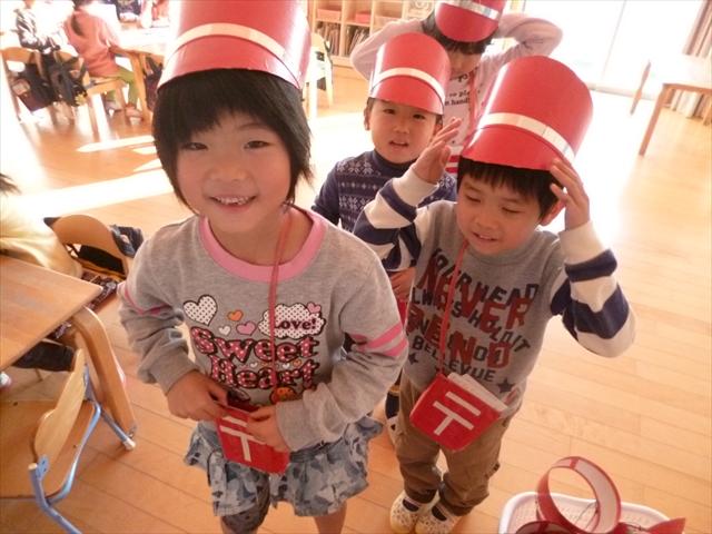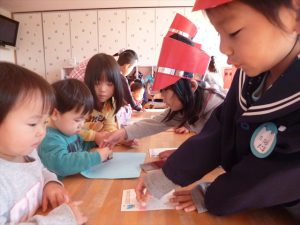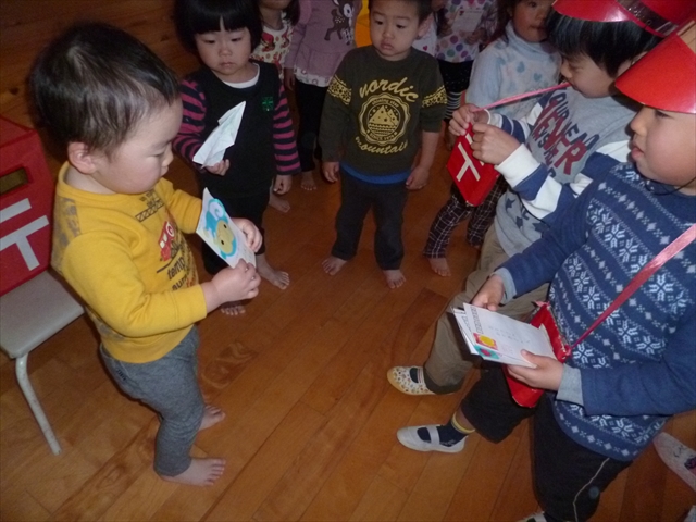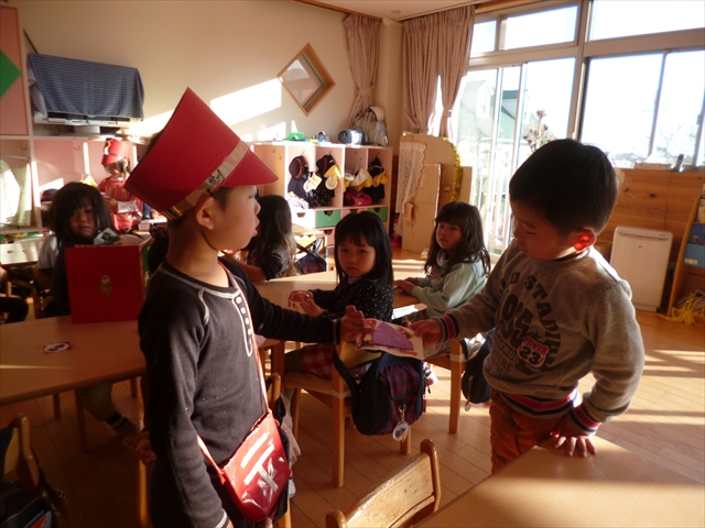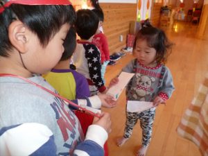 2016年1月7日 / 最終更新日時 : 2016年1月7日 kanri1 2016年1月 郵便ごっこ 『郵便ごっこ』を行いました。 赤ちゃんから年長さんまでの年賀状を 本日一日郵便局員のばら組さん(年長クラス)が受付業務&配達業務をしてくれました。 「ゆうびんでーす」「ありがとう」と言葉を交わして楽しみました!