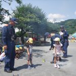 消防署の方を呼んで、花火教室を行いました。 花火の正しい持ち方を教えていただきました。 消防車を見ることもでき、目をキラキラさせていた子どもたちでした。