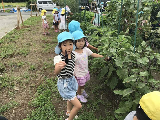 「おおきくなあれ!」毎日お水まきをして、畑にたくさんの野菜が実り始めました。