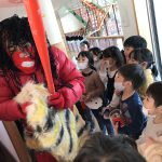 豆まきの豆を製作し、鬼退治をしようと準備していた子どもたち! 「おには~そと!」とちょっぴり怖がっていた子も豆をぶつけ鬼退治をしました。 福の神も来て、お菓子まきが始まると嬉しそうにお菓子を拾っていましたよ。